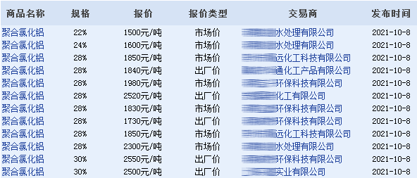 截至到2021年10月8日,據(jù)生意社大宗數(shù)據(jù)價(jià)格顯示,工業(yè)級(jí)固體聚合氯化鋁含量22%報(bào)價(jià)1500元/噸;含量24%報(bào)價(jià)1600元/噸;含量28%報(bào)價(jià)1730~2520元/噸;噴霧型含量30%報(bào)價(jià)2550元/噸。網(wǎng)絡(luò)報(bào)價(jià)只作參考,真實(shí)性無(wú)從核實(shí),不作最終購(gòu)買依據(jù),以當(dāng)天供應(yīng)商報(bào)價(jià)為準(zhǔn)!