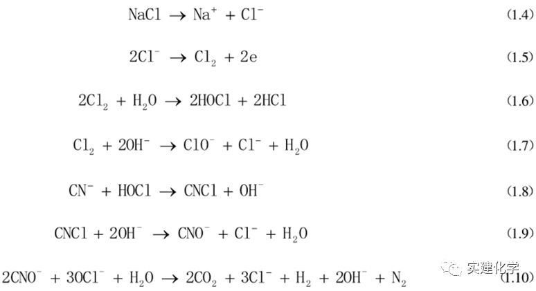 在pH>7的條件下,電解食鹽溶液,電解過程中,CN-在陽極上氧化生成CNO-、CO2和N2,同時Cl-被氧化成Cl2,Cl2水解生成HOCl,強化對氰的氧化去除。化學(xué)反應(yīng)式為: