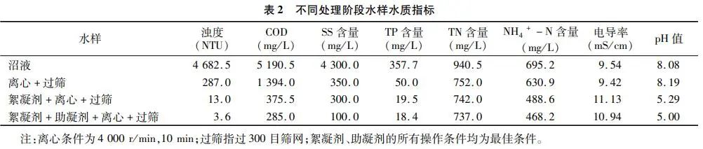 為了驗證最佳條件下的絮凝效果,以最佳的絮凝條件進行試驗,表2列出了每個步驟的出水水質(zhì)指標,沼液原樣的濁度、COD、SS含量、TP含量、TN含量、NH4+-N含量分別為4682.5NTU、5190.5mg/L、4300.0mg/L、357.7mg/L、940.5mg/L、695.2mg/L,離心過篩處理后的樣品濁度、COD、SS含量和TP含量大幅度下降,分別為287.0NTU、1394.0mg/L、350.0mg/L和50.0mg/L,表明離心和過篩可以去除大量的固形物,濁度、COD、SS去除率分別達到93.87%、73.14%、91.86%,TP的去除率達到86.02%,表明固形物中磷含量較多,TN、NH4+-N含量下降不明顯,處理后其值分別為752.0、630.9mg/L,可能原因是氮大多以小分子溶解狀態(tài)存在,不易發(fā)生絮凝。